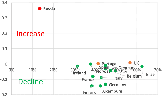 June % change in peak COVID-19 mortality vs. vaccination rate in 15 countries most affected by the delta variant.