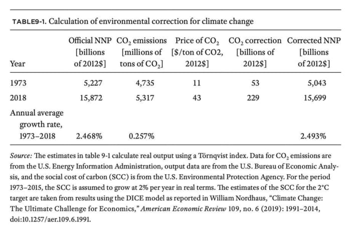 In 2018, the United States emitted 5.3 billion tons of CO2 at an estimated social cost of $44 per ton, meaning that $233.2 billion would be subtracted from the $15.9 trillion of output that year—a level correction of 1.5%.